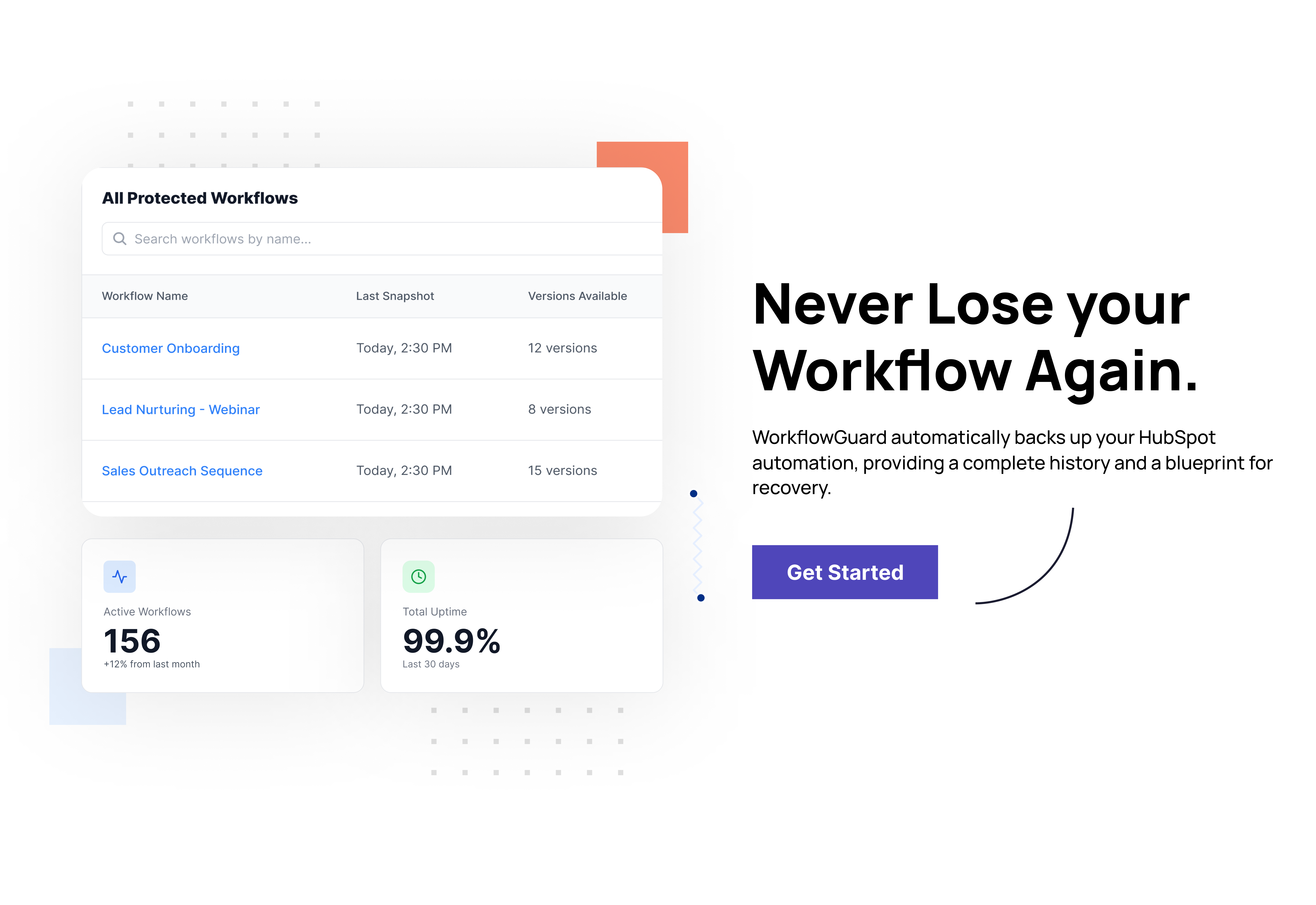 With challenges mounting, teams often look for a simple "undo" for HubSpot workflows—something easy to implement, always-on, and able to recover from mistakes instantly. That search leads to WorkflowGuard. It provides automated backups and version control, real-time monitoring with alerts, detailed analytics to optimize performance, and a one‑click rollback that restores a healthy version in seconds.